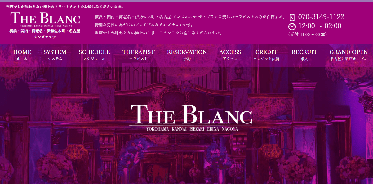JR横浜駅きた西口から徒歩圏内 12:00〜翌2:00 90分/16,000円〜070-3149-1122セラピスト数日本人 29人年齢層20代〜30代部屋タイプルーム型複数のエリアに店舗展開する有名店横浜エリアだけでなく、神奈川名古屋のエリアにも店舗展開する有名店「THE BLANC ~ザ・ブラン~」。エリア内でも安定した人気を誇り、20代~30代の美人系・綺麗系のセラピストさんを中心に採用し、HPでも顔を隠さずに掲載している子も多いことが特徴。コース料金は90分16000円ですが、エリアとしてはかなり安くコスパも高い。セラピストごとに異なるオプションが用意されているとの情報アリ。オイルマッサージリンパマッサージ日本人 -